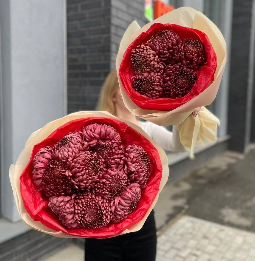 Букет из 11 бордовых премиальных хризантем