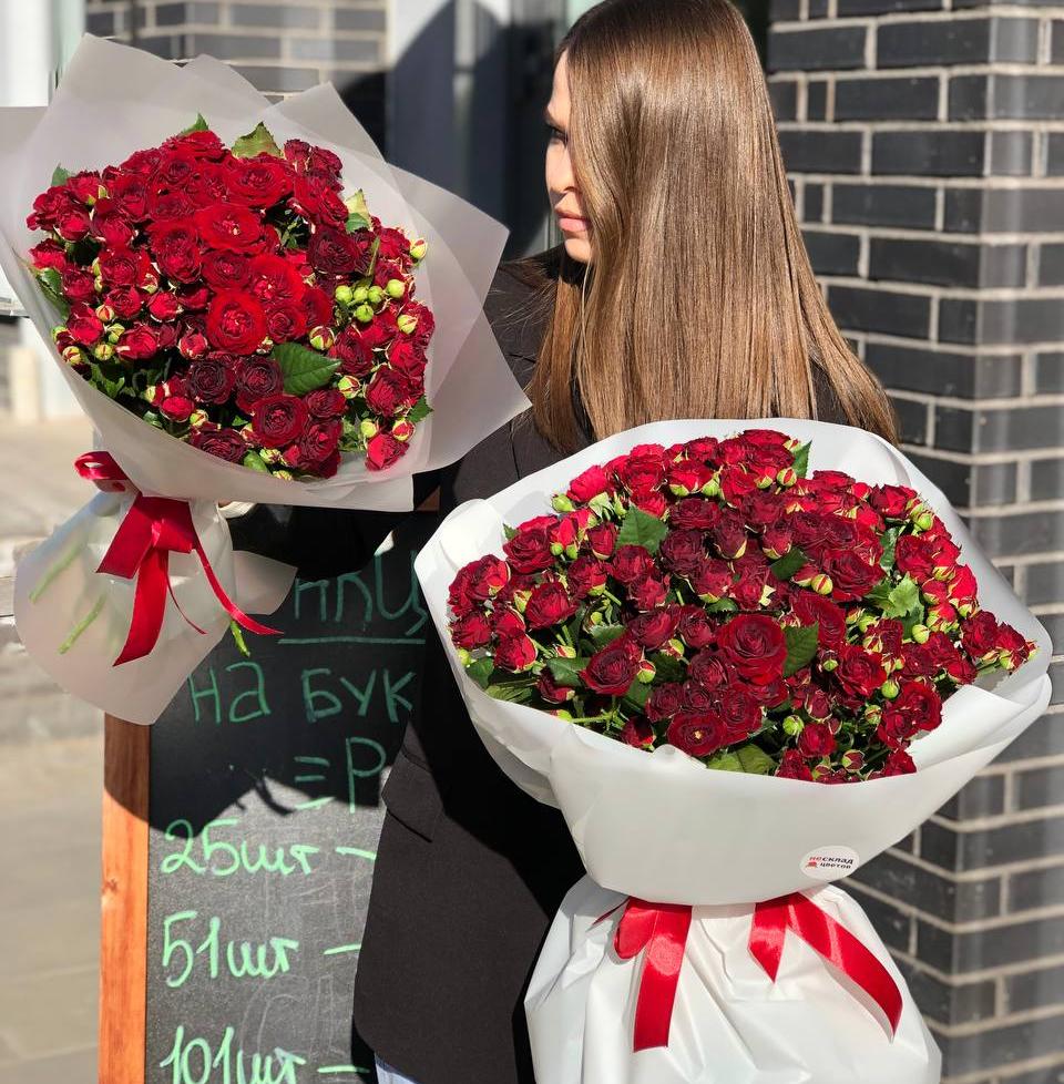 Букет из 15 красных пионовидных кустовых роз 50 см