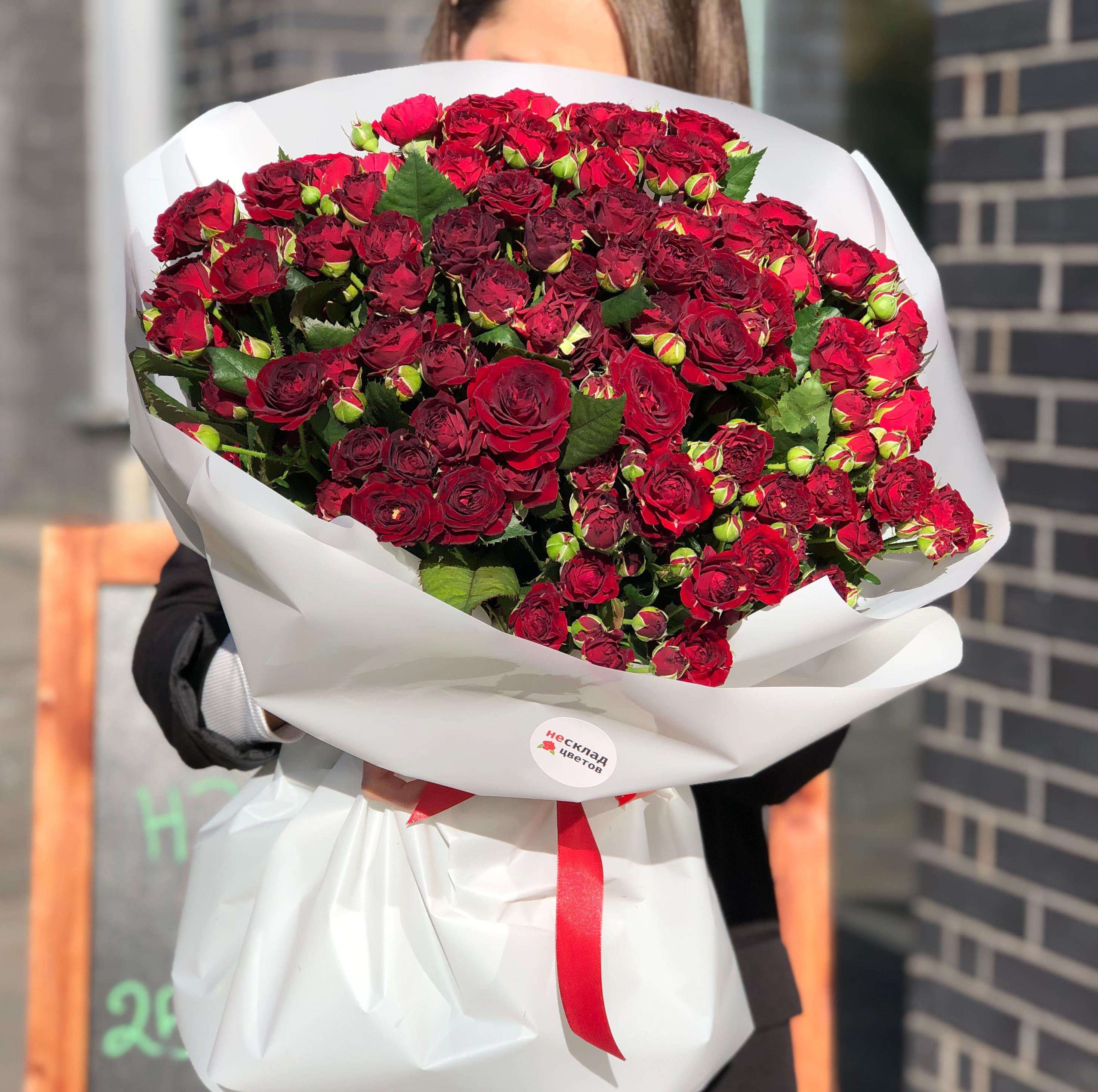 Букет из 25 красных пионовидных кустовых роз 50 см
